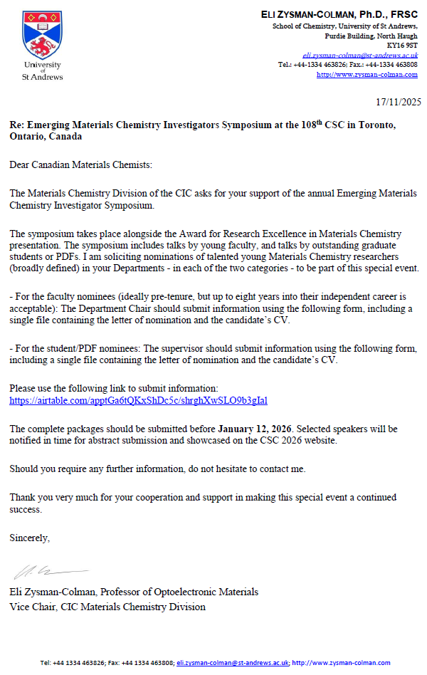 The Materials Chemistry Division invites nominations for the Investigators Symposium at the 108th CCCE in Toronto in 2026. Nominate a young faculty member, postdoctoral fellow, or a graduate student! Submit a nomination before January 12, 2026.